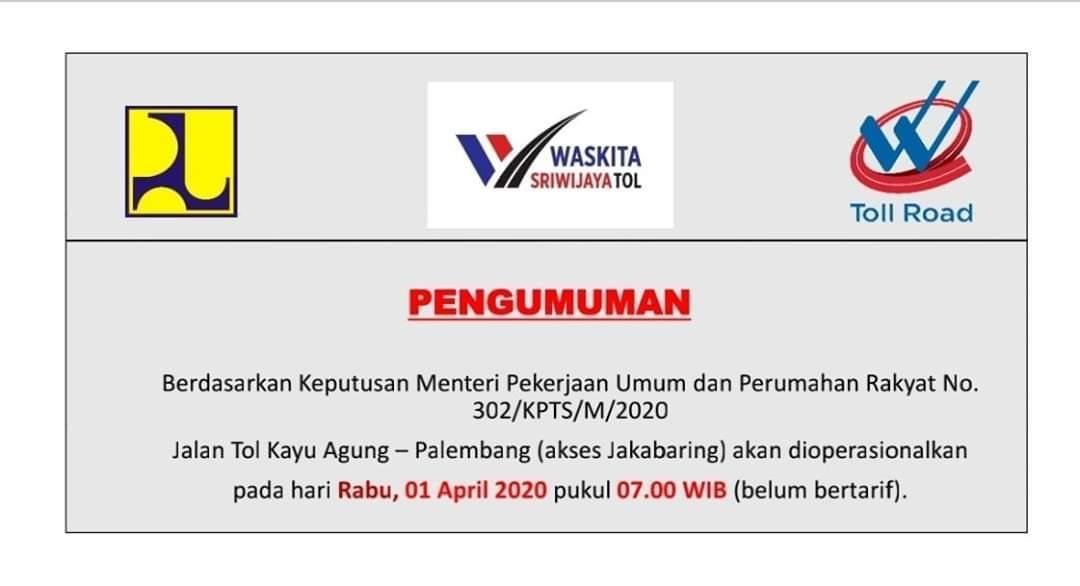 Ogan Komering Ilir | Ditengah pandemi wabah virus korona terbarukan (Covid-19), PT Waskita Sriwijaya Tol mengumumkan, terhitung Rabu (01/04/2020) mendatang, ruas Jalan Kayuagung-Palembang (Akses Jakabaring) mulai beroperasi secara cuma-cuma hingga waktu yang ditentukan kemudian.
