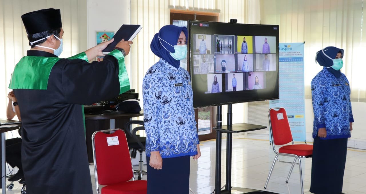 Uniknya, dalam rangkaian pengucapan sumpah/jani PNS Tenaga Fungsional Pemkab Muba ini sembilan diantaranya dilantik menggunakan video conference (vidcon) atau virtual dengan aplikasi zoom.