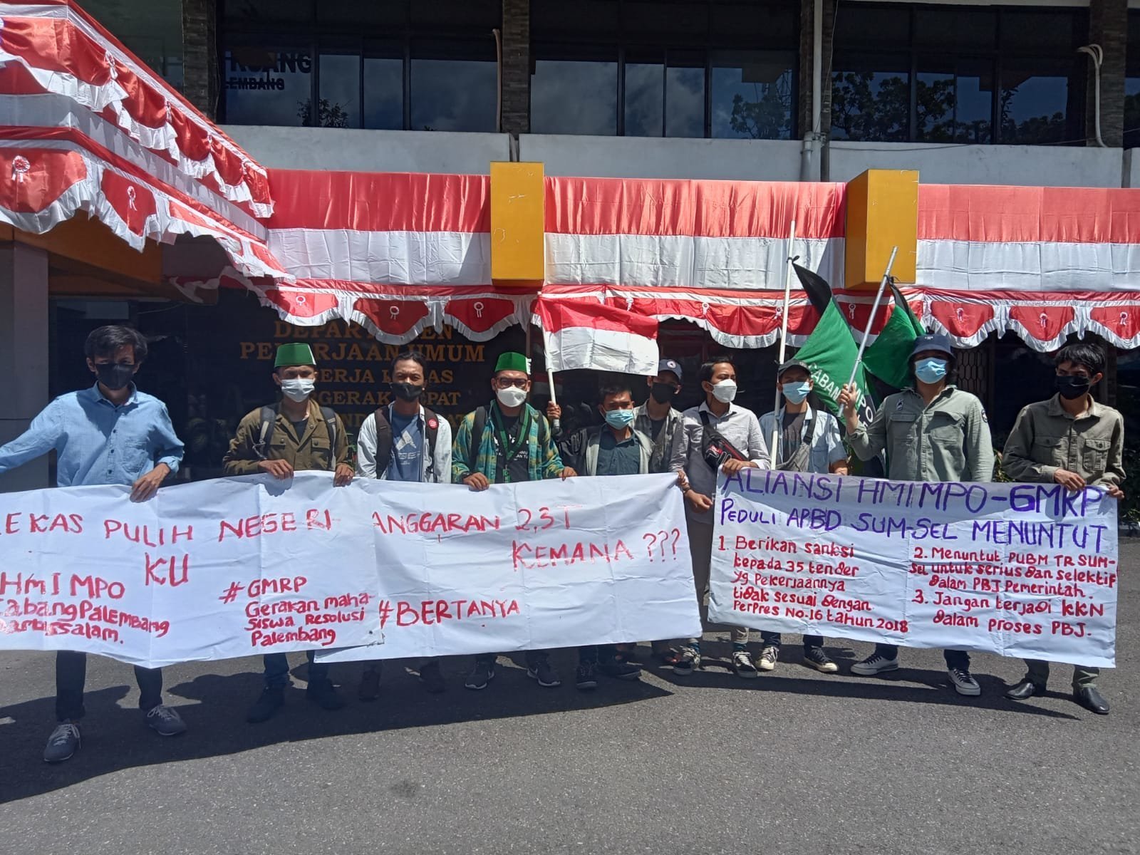 PALEMBANG – Himpunan Mahasiswa Islam (HMI) Cabang Palembang Darussalam bersama Gerakan Mahasiswa Resolusi Palembang (GMRP) menggelar aksi demonstrasi di depan Kantor Dinas Pekerjaan Umum Bina Marga dan Tata Ruang Provinsi Sumatera Selatan, Kamis 12 Agustus 2021.