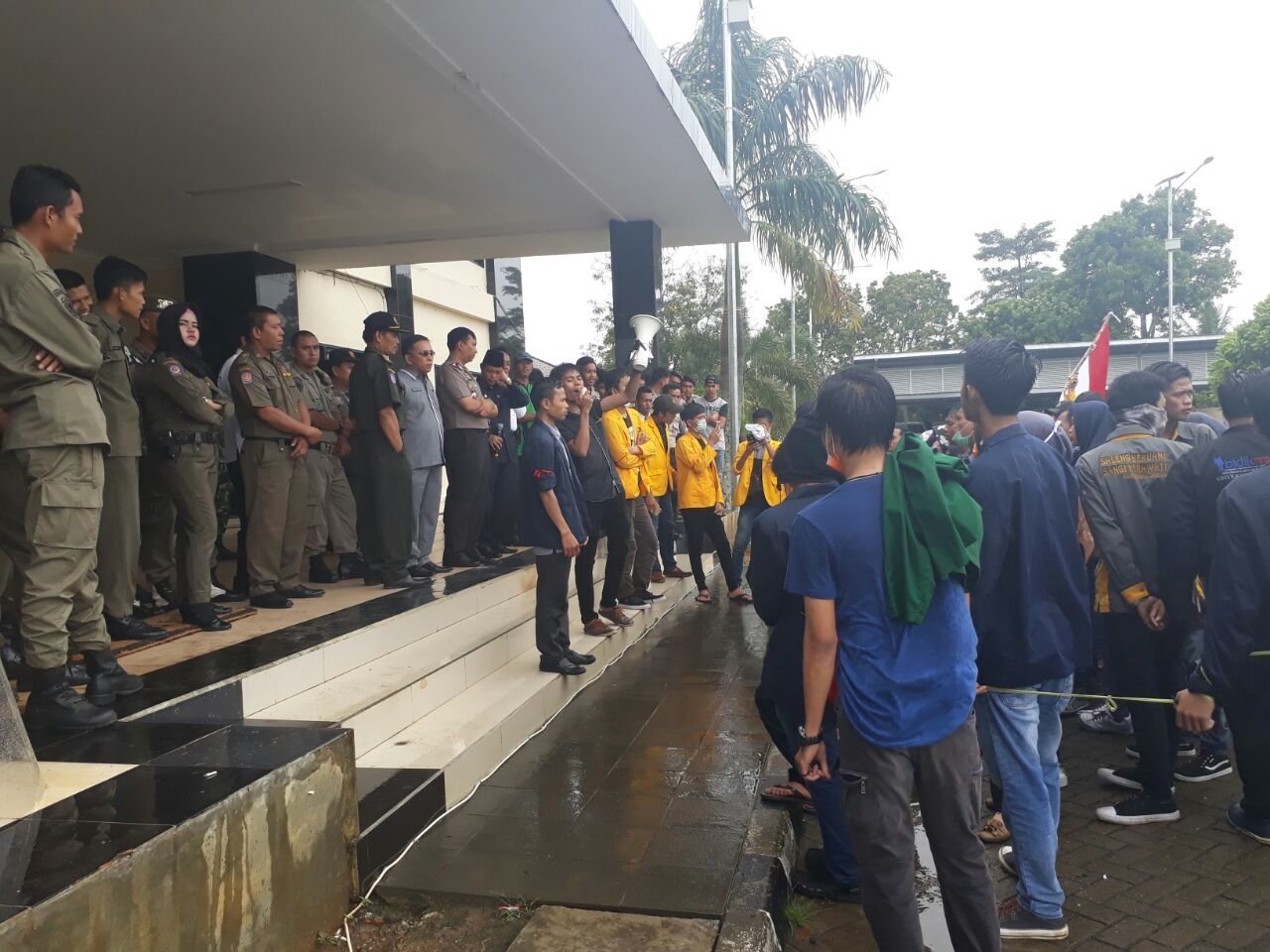Tiba di depan pintu gerbang, puluhan mahasiswa belum diperbolehkan masuk halaman Kantor Bupati. Puluhan anggota polisi dari Polres Empat Lawang dan anggota Satpol-PP berjaga di sekitaran pintu gerbang.