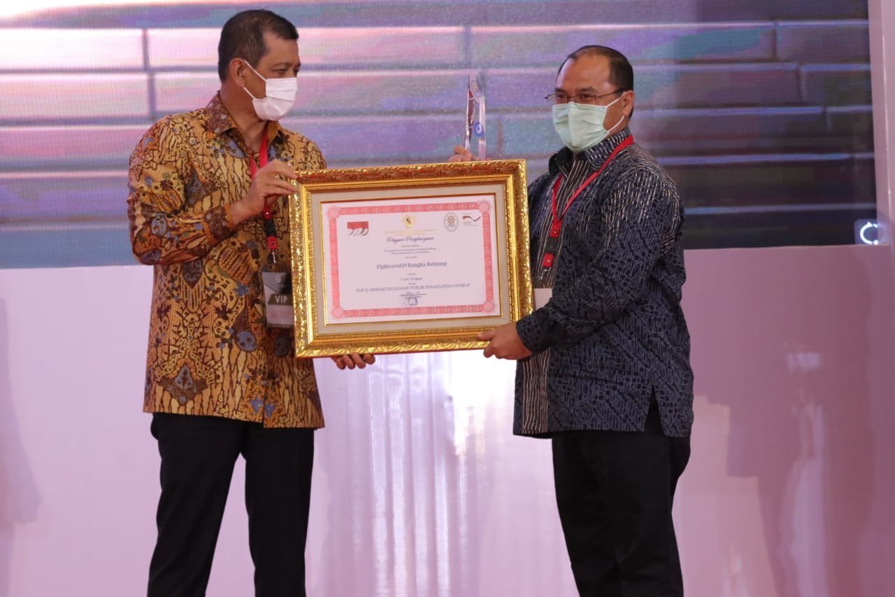 Penghargaan tersebut diserahkan oleh Ketua Satgas Covid-19 Nasional yang juga Kepala Badan Nasional Penanggulangan Bencana (BNPB), Letjen TNI Doni Monardo dan diterima langsung oleh Gubernur Kepulauan Bangka Belitung, Ezaldi Rosman dalam acara Awarding Top Inovasi, Inovasi Penanganan Covid-19, dan Pengelola Pengaduan Pelayanan Publik Terbaik di Gedung Tribrata, Jakarta, Rabu (25/11/20).