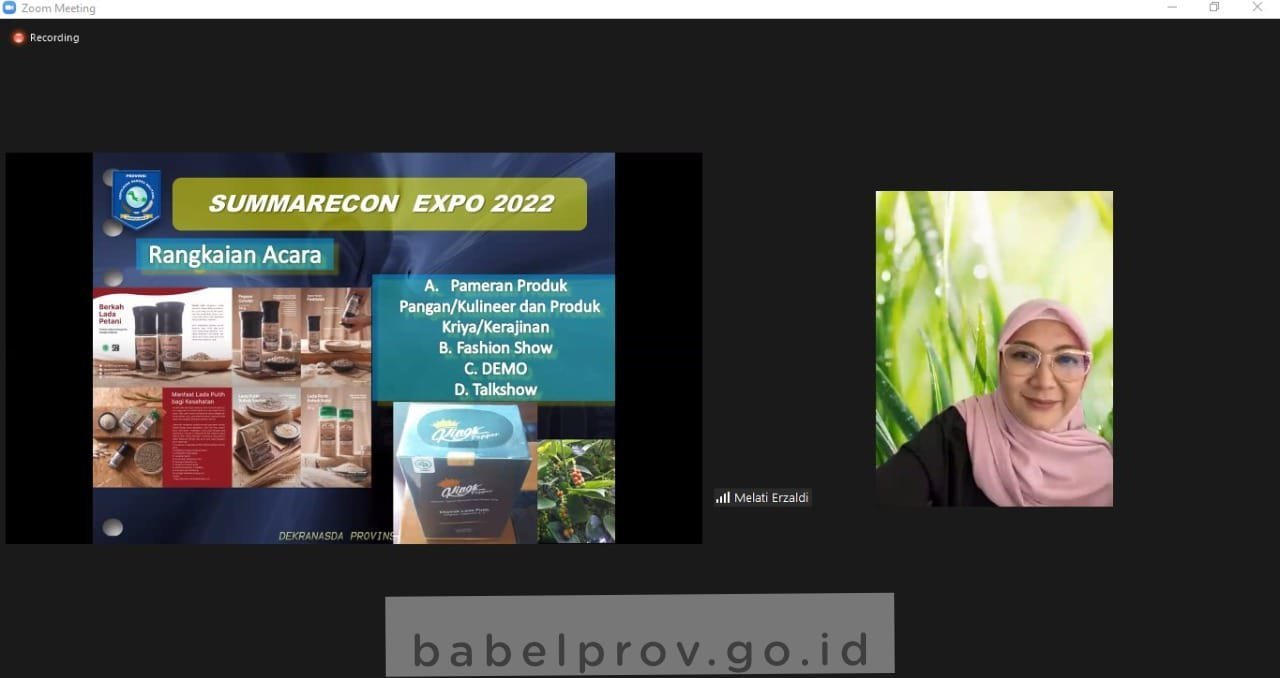 PANGKALPINANG – Tidak ingin melepaskan begitu saja kesempatan untuk mengenalkan Kriya dan UMKM Kepulauan Bangka Belitung berskala nasional dalam gelaran Summarecon Expo 2022, Ketua Dewan Kerajinan Nasional Daerah Kepulauan Bangka Belitung (Dekranasda Babel), Melati Erzaldi Kamis (7/4/22), memimpin secara langsung melalui Zoom Meeting rapat persiapan pameran produk pangan, kuliner, dan kriya Kepulauan Bangka Belitung yang akan diselenggarkan di Mall Summarecon.