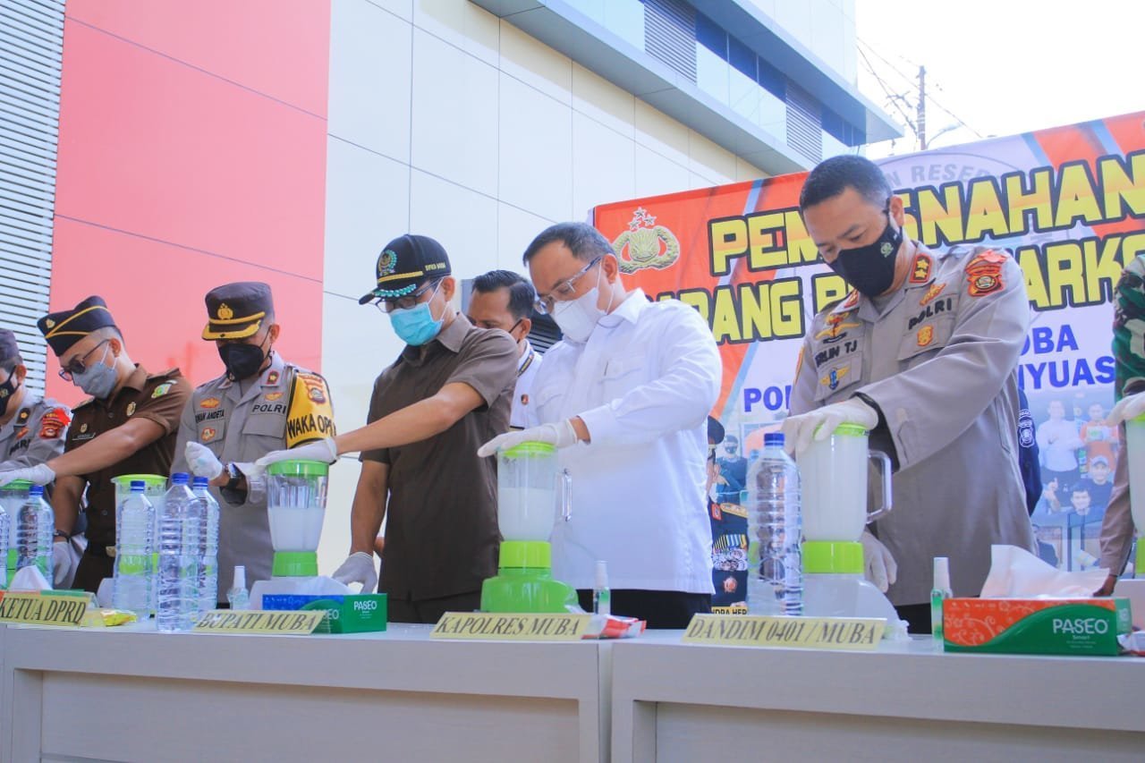 “Terlebih lagi hari ini Polres Muba telah berhasil mengungkap narkotika jenis sabu dengan berat 10 Kg. Ini merupakan suatu keberhasilan, kerja keras yang telah dilakukan oleh Polres Muba beserta jajaran ini bisa di meminimalisir dan mencegah peredaran narkotika,”ungkap Bupati Muba Dr H Dodi Reza Alex Noerdin saat melakukan Pemusnahan Barang Bukti Narkotika Jenis Sabu, Rabu (5/5/2021) di Polres Muba.