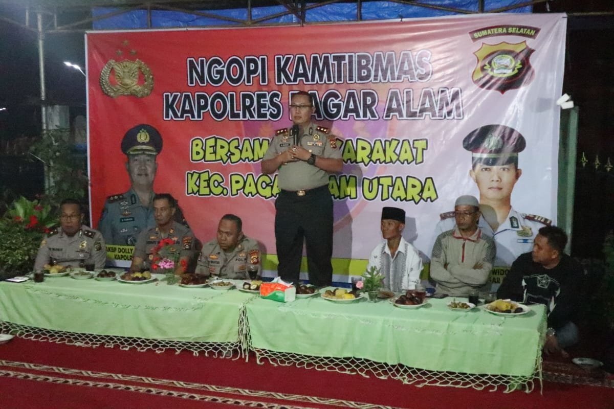 Pagaralam | Kapolres Pagaralam AKBP Dolly Gumara, Sik, MH terjun langsung ke lapangan serta membaur dengan masyarakat, menjalin kedekatan, dan menyerap aspirasi dari warga melalui kegiatan ‘Ngopi’ (Ngobrol Pintar) Kamtibmas Bareng Kapolres, Selasa (8/10/2019) malam.