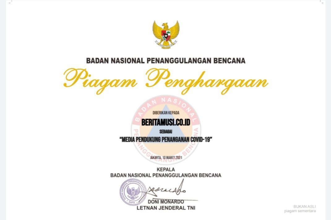 Beritamusi.co.id Terima Penghargaan Media Faktual dan Mendidik Penanganan Covid19 dari BNPB Khusus untuk kategori media, BNPB memberikan penghargaan kepada sekitar 200 media dari berbagai platform, baik cetak, elektronik, serta media online dari seluruh Indonesia.