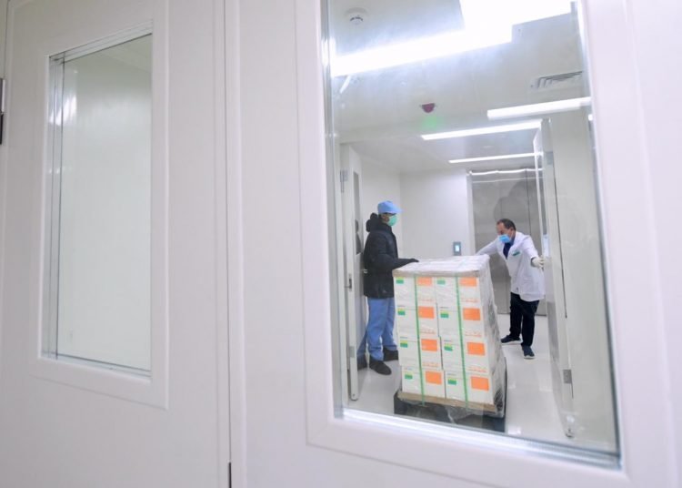 Selanjutnya vaksin dipindahkan dari envirotainer untuk disimpan di cool room dengan suhu 2-8 derajat celcius. Ruangan tersebut telah disterilisasi dan disiapkan khusus untuk menyimpan vaksin COVID-19.