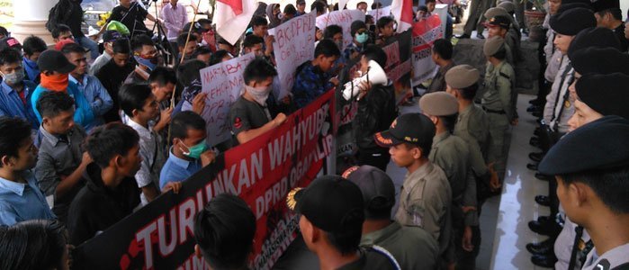 Massa berjumlah puluhan orang tersebut dijaga ketat aparat Pol PP dan petugas Polsek dan Polres OI. Massa membawa spanduk berisikan antara lain martabat kehormatan DPRD harus wajib dijaga, turunkan Wahyudi dari pimpinan DPRD OI dan BK DPRD Ogan Ilir harus bersikap tegas.