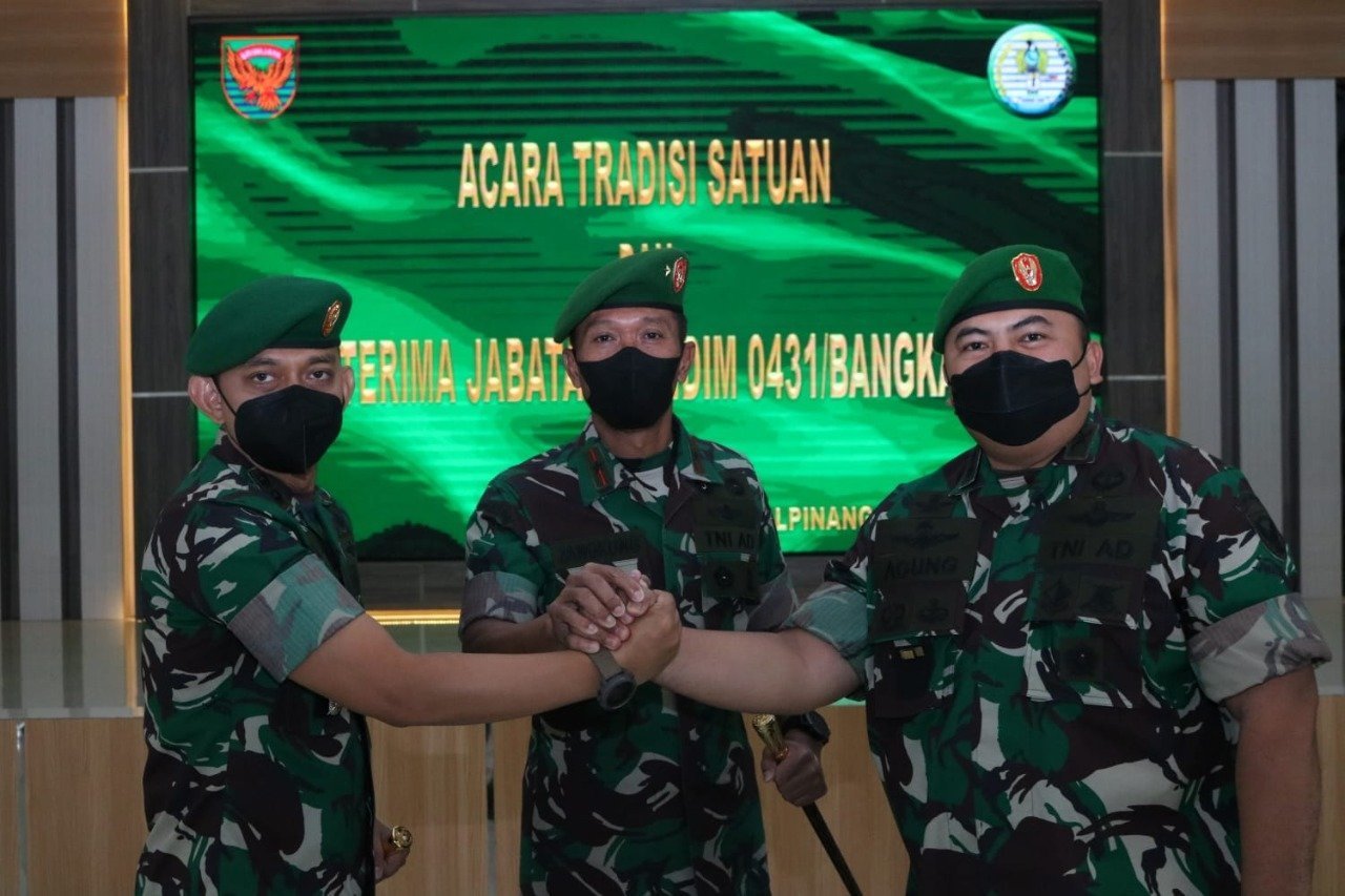 PANGKALPINANG | Danrem 045/Garuda Jaya, Brigjen TNI M Jangkung Widyanto memimpin serah terima jabatan Dandim 0431/Bangka Barat dari Letkol Inf Agung Wahyu Perkasa kepada Letkol Inf Deri Indrawan. Kegiatan itu berlangsung di Aula Makorem 045/ Garuda Jaya, Pangkalpinang Provinsi Kepulauan Bangka Belitung (Babel), Kamis (13/1/2022).