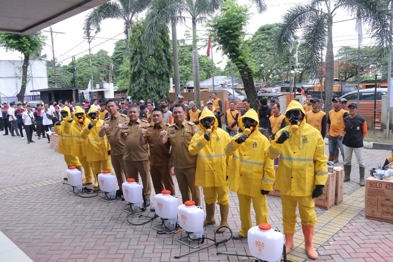 Senin (23/3/2020) pagi, Dinas Perumahan Rakyat dan Kawasan Permukiman (Pera KP) Kota Palembang melepas 100 petugas sukarela untuk melakukan penyemprotan disinfektan di tiga kecamatan.