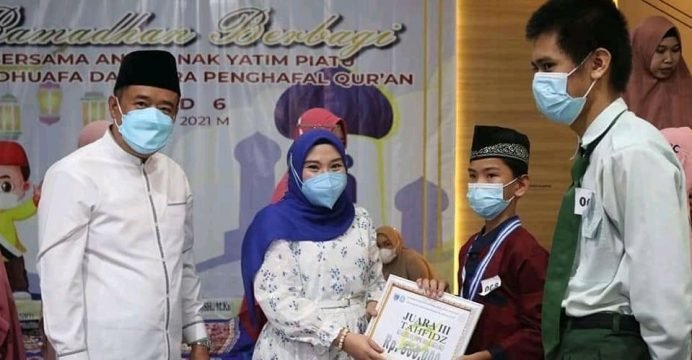 LAHAT – Bupati Lahat, Cik Ujang SH memberikan logam emas kepada anak Yatim saat menutup kegiatan resmi Ramadhan berbagai bersama anak yatim piatu, kaum duafa dan para tahfiz Al Qur’an di Kota Lahat, yang digelar oleh Jumat Sedekah. Sebelumnya, sejumlah perlombaan diikuti.