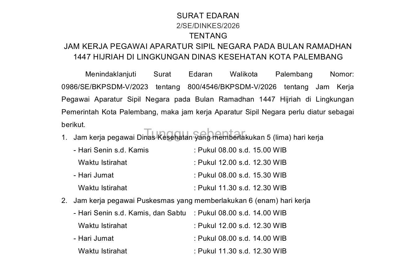 Palembang – Dinas Kesehatan Kota Palembang resmi mengeluarkan kebijakan terbaru mengenai penyesuaian jam kerja bagi seluruh Aparatur Sipil Negara di lingkungannya selama bulan suci Ramadhan 1447 Hijriah.