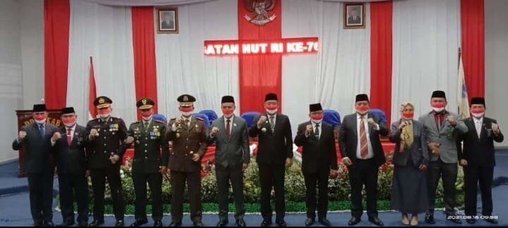 LAHAT – Unsur Pimpinan Dewan Perwakilan Rakyat Daerah (DPRD), Ketua Fitrizal Homizi ST, Wakil Ketua 1, Gaharu SE MM dan Wakil Ketua 2, Sri Marhaeni Wulansih SH didampingi Bupati Lahat, Cik Ujang SH, Wakil Bupati (Wabup), H Haryanto SE MM MBA dan Forkompimda mendengarkan pidato kenegaraan, yang disampaikan Presiden RI, Joko Widodo.