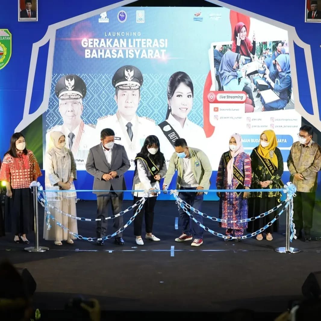 Launching Gerakan Literasi Bahasa Isyarat kali ini ditandai dengan pengguntingan pita oleh Duta Literasi Sumsel Ratu Tenny Leriva S. Ked disaksikan oleh Gubernur H Herman Deru Ketua Tim Penggerak PKK Provinsi Sumsel Hj. Febrita Lustia Herman Deru, Ketua ICSB Korwil Sumsel Hj. Samantha Tivani, Kepala Perwakilan Bank Indonesia Provinsi Sumsel Erwin Soeriadimadja, Bupati Kabupaten Muara Enim H. Nasrun Umar, Wakil Bupati Pali Drs. H. Soemarjono, Bunda Literasi Kabupaten Muara Enim Hj. Reni Nasrun, Bunda Literasi Kabupaten Empat Lawang Hepi Safriani. (Ade)