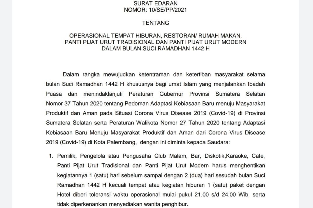 PALEMBANG – Mewujudkan ketentraman dan ketertiban masyarakat selama bulan Suci Ramadhan 1442 H, bagi umat Islam. Wali Kota Palembang H. Harnojoyo mengeluarkan surat edaran nomor : 10/SE/PP/2021 tentang operasional rumah makan, tempat hiburan, pijat urut tradisional maupun modern selama Ramadhan.