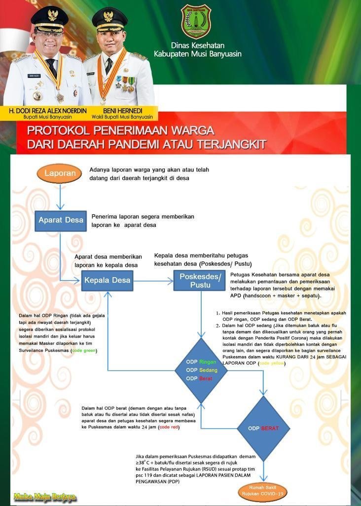 Melalui Dinas Kesehatan Muba, Bupati Muba Dodi Reza Alex menginstruksikan Dinkes dan Forkopimcam bersama puskesmas dan puskesmas pembantu di seluruh wilayah Muba mensosialisasikan dan mengedukasi tata cara menerima warga yang sebelumnya berdomisili dari daerah terjangkit.