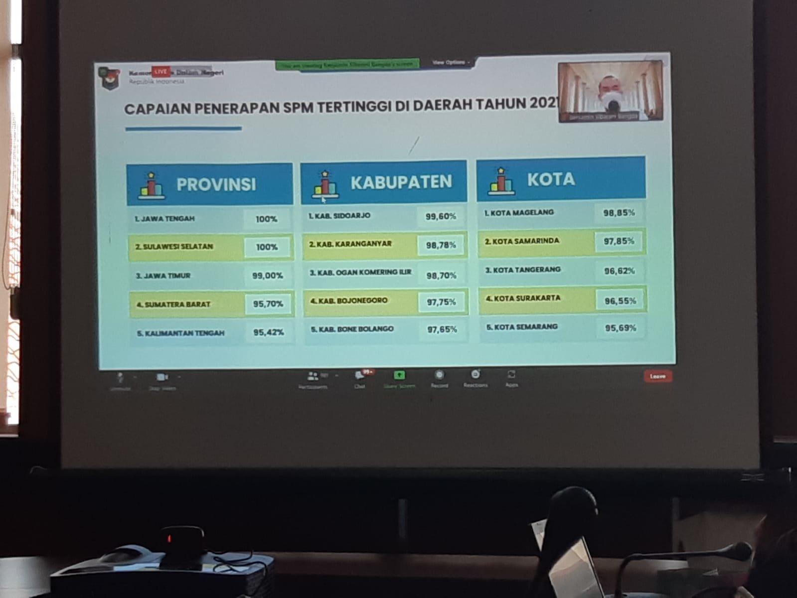 Dalam kesempatan tersebut juga disampaikan 5 Provinsi, Kabupaten dan Kota yang meraih capaian SPM tertinggi. Dalam hal ini, Kabupaten Ogan Komering Ilir menempati posisi ketiga dengan capaian 98,70 persen. (Romi)