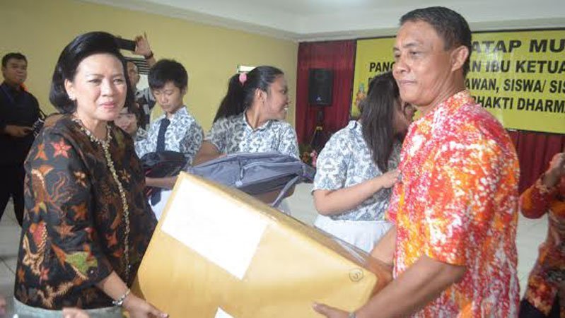 Dalam kesempatan tersebut, Ketum Dharma Pertiwi menyerahkan bantuan berupa, alat tulis, tas sekolah dan cindera mata yang diterima secara simbolis oleh Kepala Sekolah SLB dan perwakilan murid. “Saya berharap agar para guru dan murid di sekolah ini tetap semangat dalam kegiata mengajar dan belajar. Semoga bantuan ini dapat memberikan manfaat,” katanya.