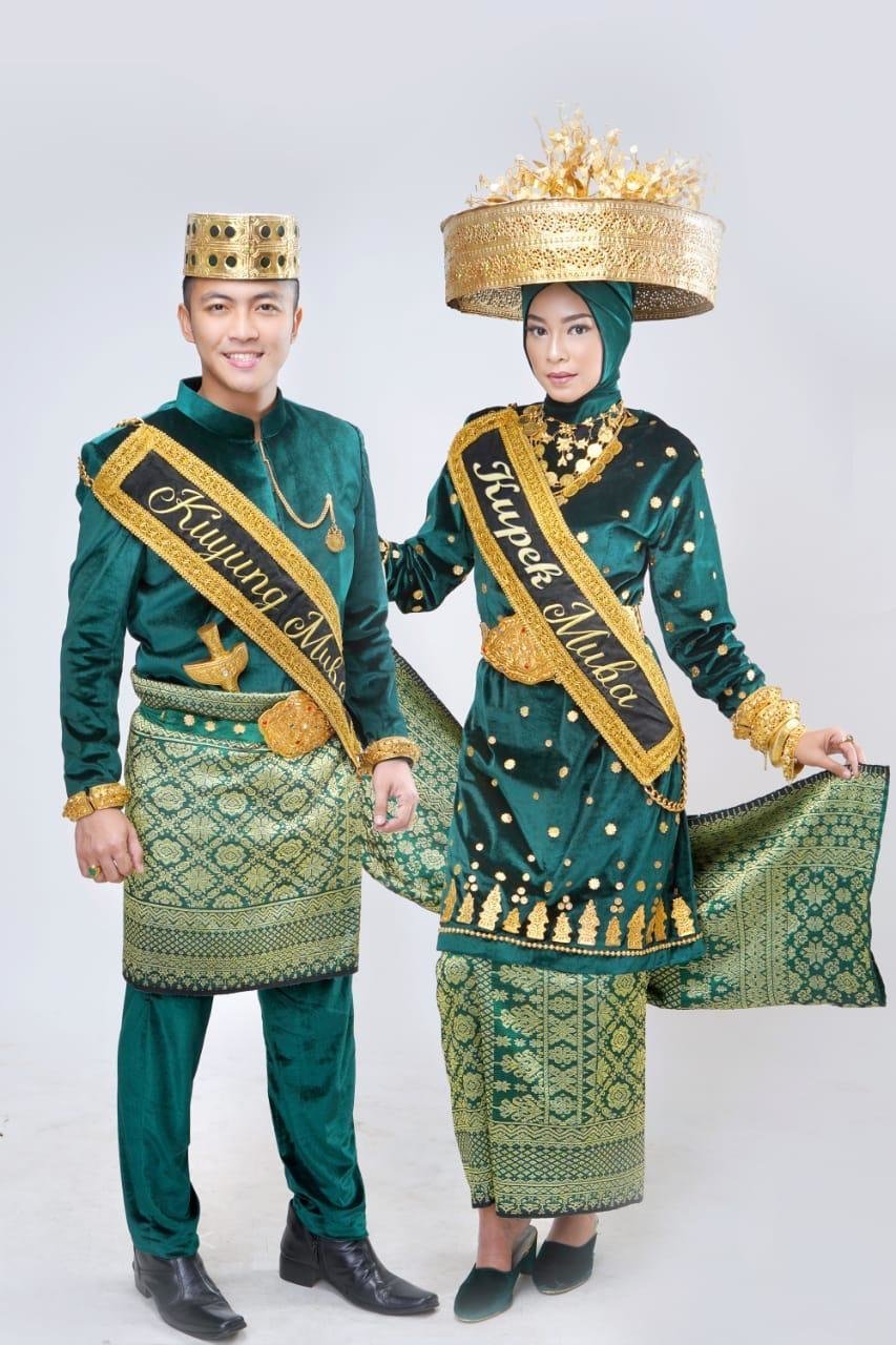 “Aksesoris yang dipakai untuk wanita, dibagian kepala terdapat Loyang berukir bersepuh emas dan bertata bebatuan yang dibagian puncaknya juga terdapat ornament keemasan selain fugsinya memang sebagai wadah atau tempat menaruh lemang. Menggunakan subang koin dua tingkat di leher, kalung anak ayam,pending di bangian pinggang, 2 gelang masing-masing dikiri kanan terdiri dari gelang sempuru dan kano serta cicin zamrud di jari manis dan selop tutup,” ujar keduanya di sela Malam Grand Final Pemilihan Putra Putri Sriwijaya 2019.