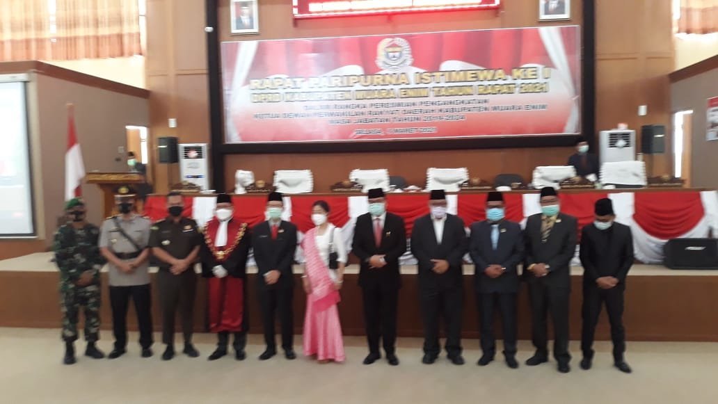 MUARA ENIM – Pelantikan Ketua DPRD Kabupaten Muara Enim masa jabatan 2019-2024 oleh Ketua Pengadilan Negeri Muara Enim, dalam Sidang Paripurna istimewa pertama DPRD Muara Enim di Ruang rapat paripurna DPRD Muara Enim, Selasa (09/03/21) dihadiri PLH Bupati Muara Enim, unsur Forkompinda, Tokoh Masyarakat dan tokoh Agama serta Organisasi Masyarakat.