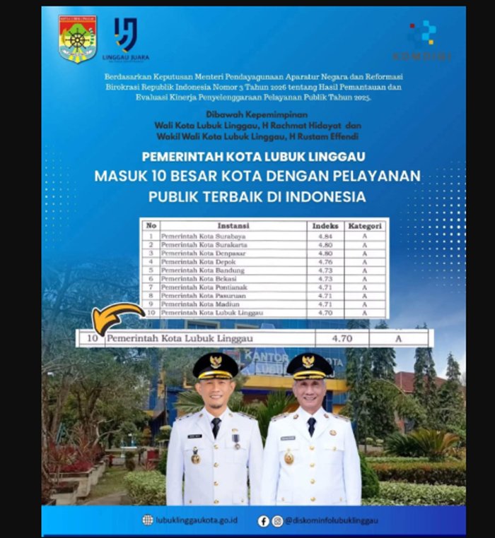 LUBUK LINGGAU- Kota Lubuk Linggau kembali menorehkan prestasi di tingkat nasional. Berdasarkan Keputusan Menteri Pendayagunaan Aparatur Negara dan Reformasi Birokrasi Republik Indonesia Nomor 3 Tahun 2026 tentang Hasil Pemantauan dan Evaluasi Kinerja Penyelenggaraan Pelayanan Publik Tahun 2025, Pemerintah Kota Lubuk Linggau berhasil menembus 10 besar kota dengan kualitas pelayanan publik terbaik di Indonesia.