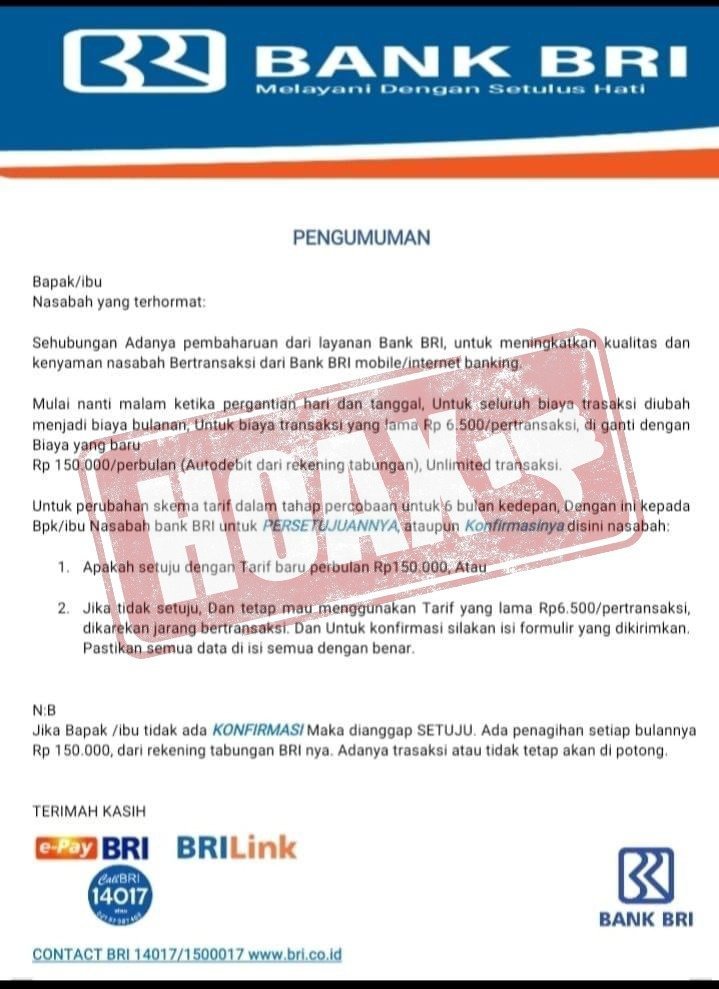 Saat dikonfirmasi ke pihak bank, Corporate Secretary BRI Aestika Oryza Gunarto menyatakan bahwa hal tersebut dipastikan tidak benar. Pihaknya mengatakan, atas maraknya upaya penipuan tersebut, BRI tidak henti-hentinya mengimbau masyarakat, khususnya yang menjadi nasabah BRI untuk senantiasa berhati-hati dan waspada terhadap berbagai tindak penipuan kejahatan perbankan, termasuk dengan yang mengatasnamakan BRI.