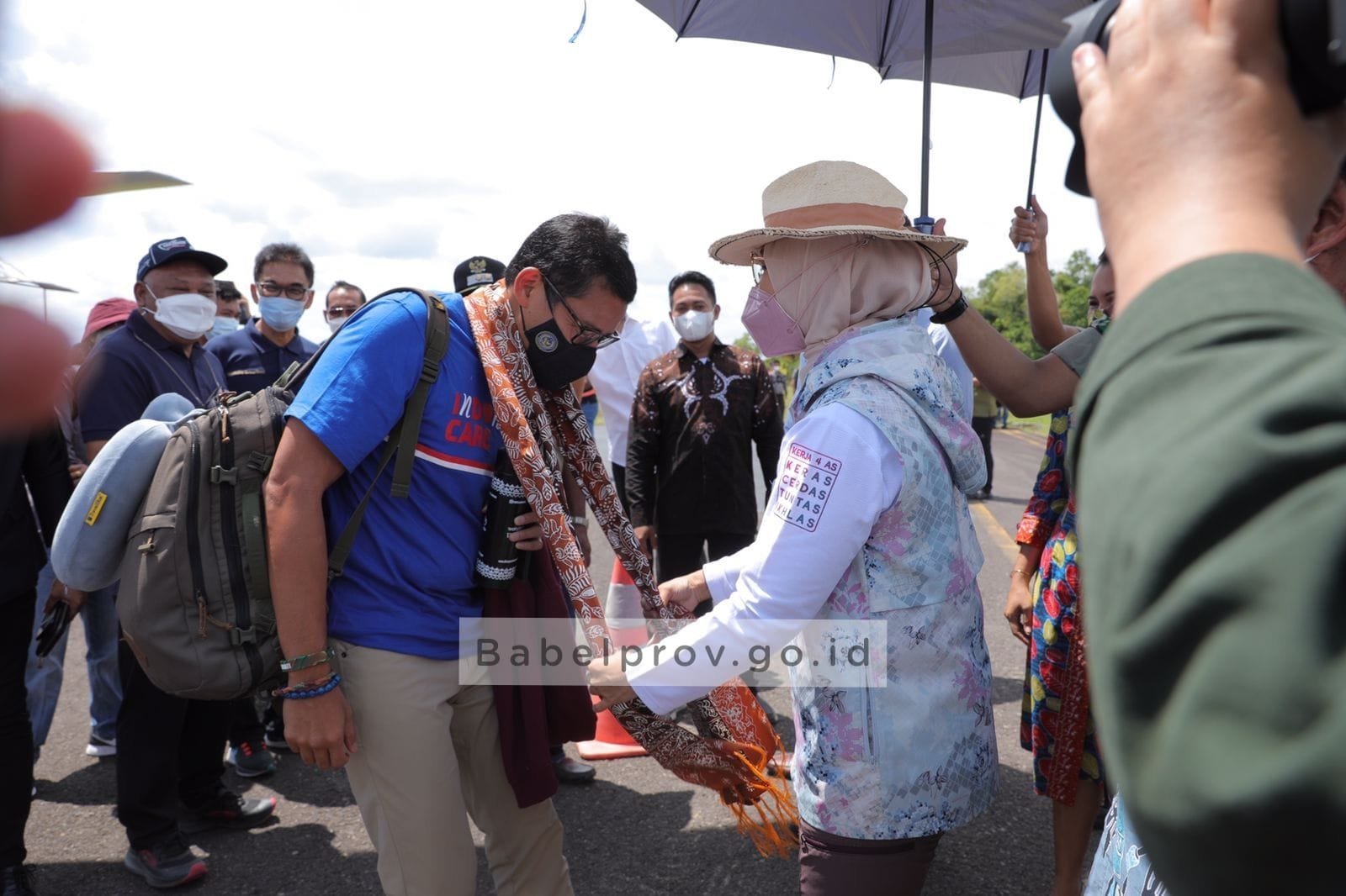 BELITUNG – Dewan Pembina Gerakan Ekonomi Kreatif Nasional (Gekrafs) Provinsi Kepulauan Bangka Belitung, Melati Erzaldi mendampingi Wakil Gubernur Kepulauan Bangka Belitung (Babel), Abdul Fatah menyambut kedatangan Menteri Pariwisata dan Ekonomi Kreatif (Parekraf) RI di Base Ops Lanud HAS Hanandjoeddinn Tanjung Pandan, Kabupaten Belitung, Sabtu (26/2/2022).