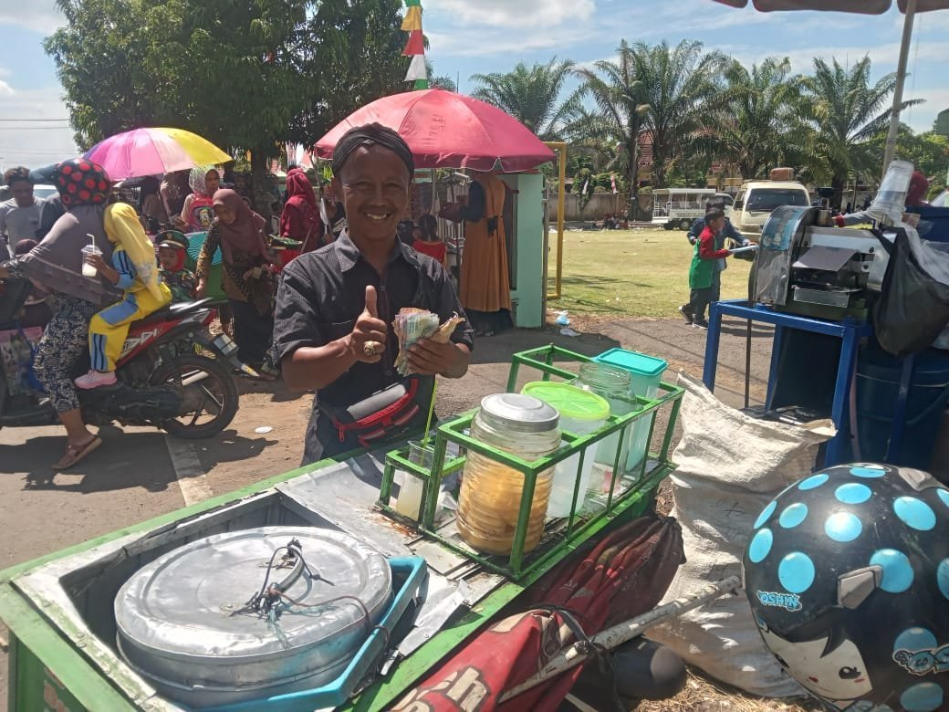 MUSI RAWAS | Senyum bahagia tak bisa ditutupi dari raut wajah Riadi (42), pasalnya tak butuh waktu lama dagangan Es campur yang ia bawa ludes diserbu pembeli.