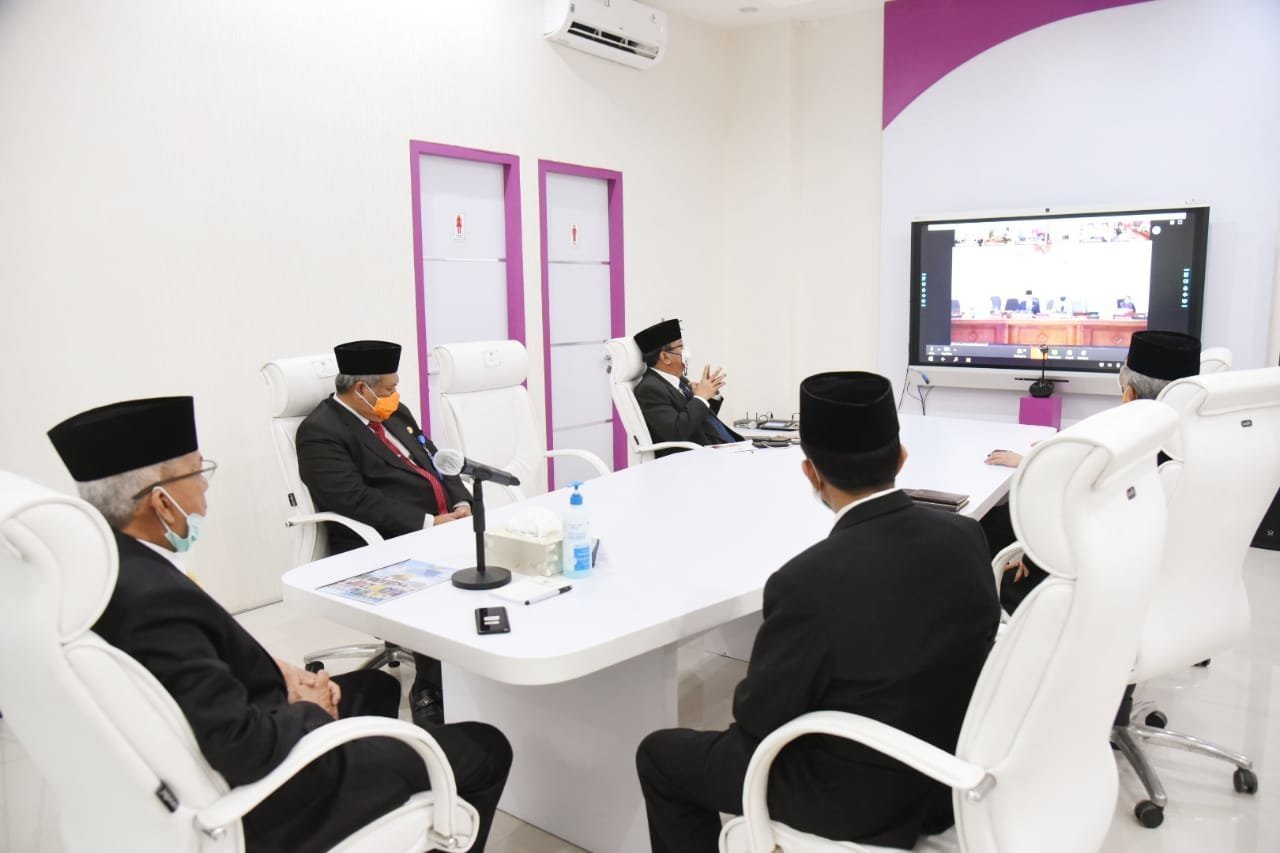 Dalam rapat paripurna virtual itu, Wagub Sumsel H. Mawardi Yahya tampak disampingi Asisten I Bidang Pemerintahan dan Kesra Pemprov Sumsel Akhmad Najib, Asisten II Bidang Ekonomi Keuangan dan Pembangunan Yohanes Toruan, Asisten III Bidang Administrasi dan Umum Pemprov Sumsel Prof. Edward Juliartha, Plt Kepala Biro Pemerintahan dan Otonomi Daerah, Ahmad Rizali. (Ade)