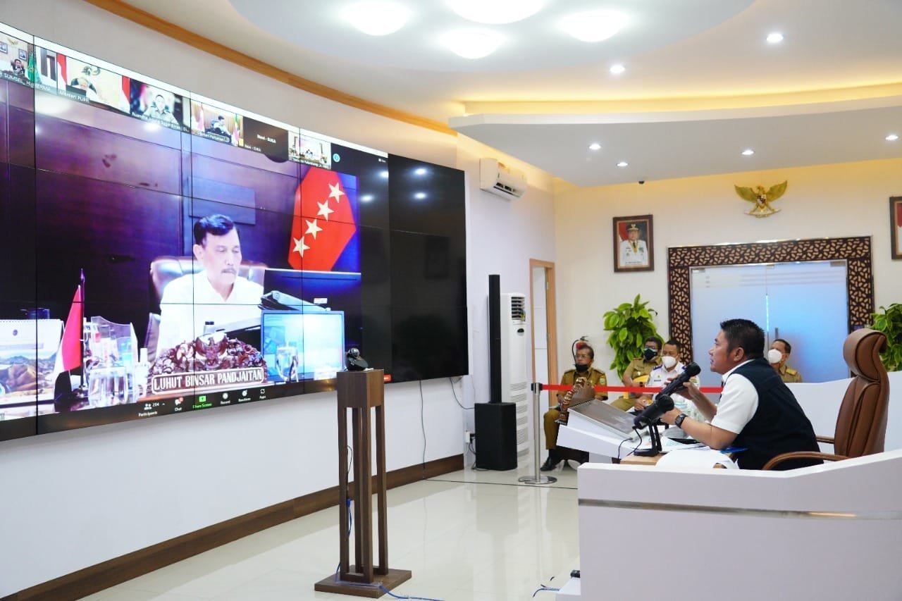 Herman Deru saat ikuti Rapat Koordinasi (Rakor) Pembahasan Percepatan Pembangunan Infrastruktur dan Pengembangan Wilayah di Provinsi Sumsel, bersama lima Menteri Kabinet Indonesia Maju secara virtual di Command Center, Senin (9/8) siang.