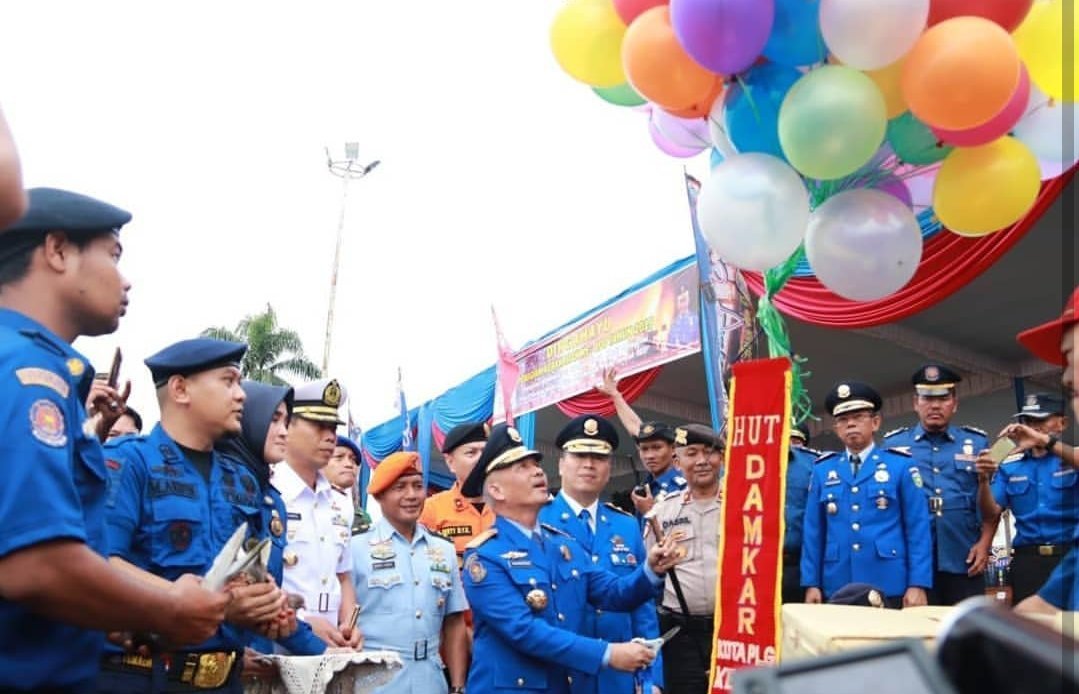HUT ke-100 Pemadam Kebakaran diwarnai dengan pelepasan balon dan burung merpati. Selain itu diperagakan senam komando dan simulasi pemadam kebakaran. (Alam)