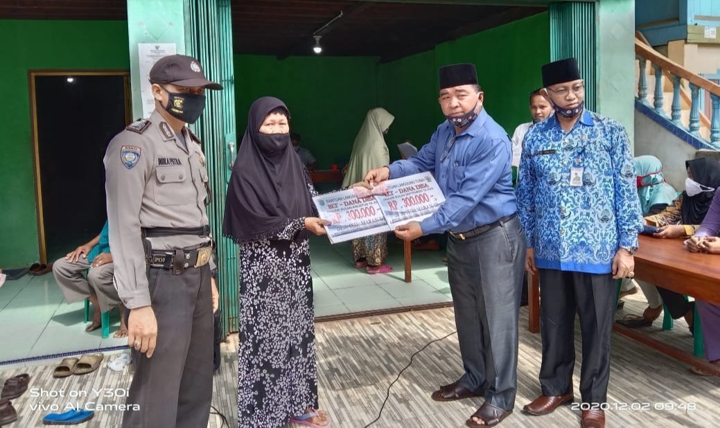 Pembagian BLT DD yang disaksikan unsur tripika Kecamatan Pedamaran di kediaman Kepala Desa (Kades) Pedamaran VI Dusun IV, dengan tetap mengedepankan protokol kesehatan (prokes) Covid-19, Rabu (2/12/2020).