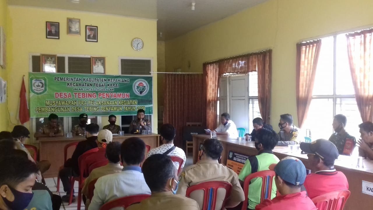 KEPAHIANG | Desa Tebing Penyamun, Kecamatan Tebat Karai, melakukan kegiatan musyawarah dalam rangka Pra pelaksanaan kegiatan pembangunan Desa Tebat Karai, Selasa (11/8/2020). Pelaksanaan kegiatan ini menandakan awal untuk pembangunan fisik di desa Tebing Penyamun dengan tujuannya untuk mewujudkan masyarakat adil dan makmur.
