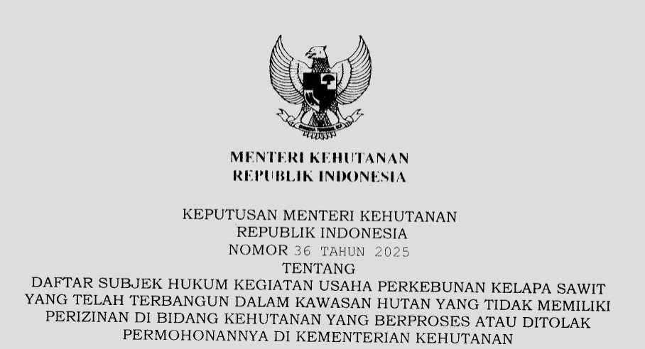 Keputusan ini diterbitkan sebagai tindak lanjut dari Peraturan Presiden Nomor 5 Tahun 2025 tentang Penertiban Kawasan Hutan.