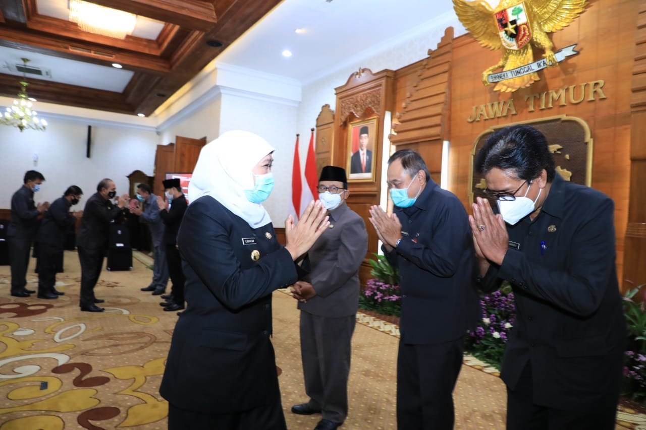 Segenap Forkopimda juga proaktif membantu bahkan Babinsa dan Babinkabtibmas juga bersatu menyukseskan Pilkada yang aman dan kondusif,” ujar Gubernur Jatim Khofifah Indar Parawansa saat menyerahkan Nota Pelaksanaan Tugas Pjs Bupati Mojokerto, Pjs Bupati Blitar, Pjs Walikota Blitar dan Pjs Bupati Trenggalek kepada Bupati Mojokerto, Bupati Blitar, Walikota Blitar dan Bupati Trenggalek di Gedung Negara Grahadi, Surabaya, Sabtu (5/12/2020) malam.