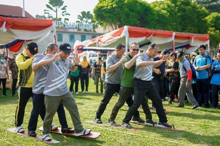 Rangkaian lomba yang meriah ini ditandai dengan Pj Bupati Drs Apriyadi MSi bersama Forkopimda bermain Terompah Panjang.
