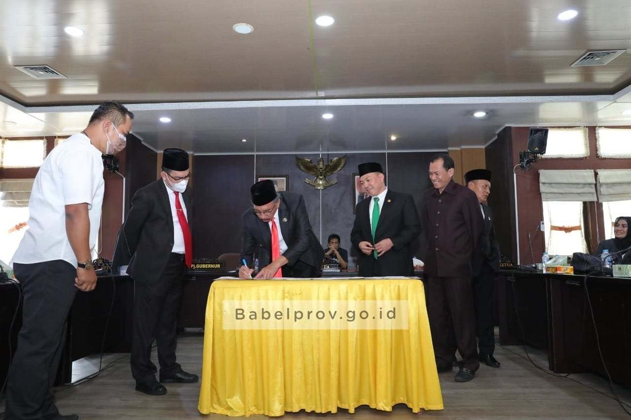PANGKALPINANG – Penjabat (Pj) Gubernur Kepulauan Bangka Belitung (Babel) Ridwan Djamaluddin dengan DPRD Babel menandatangani kesepakatan bersama terkait penambahan kegiatan baru pada Kebijakan Umum APBD (KUA) dan Prioritas dan Plafon Anggaran Sementara (PPAS) yang bertempat di Ruang Badan Anggaran (Banggar) DPRD Babel, Rabu (8/6/2022).