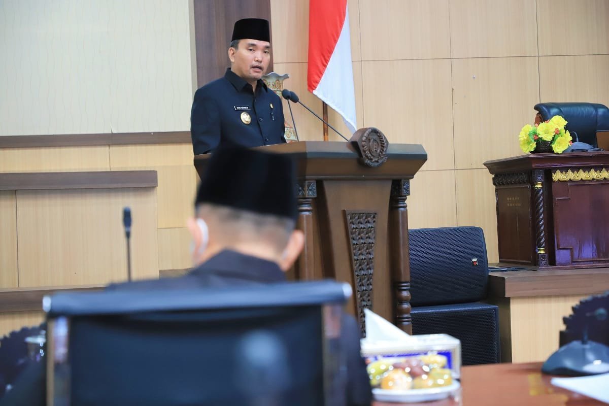 MUSI BANYUASIN – Pelaksana Tugas Bupati Musi Banyuasin (Muba), Beni Hernedi SIP menyampaikan Laporan Keterangan Pertanggungjawaban (LKPJ) atas Pelaksanaan Tugas Penyelenggaraan Pemerintah Daerah Tahun Anggaran 2021, Pada Rapat Paripurna Masa Persidangan II Rapat ke-7 yang digelar di Ruang Rapat Paripurna DPRD Kabupaten Muba, Senin (28/3/2022)