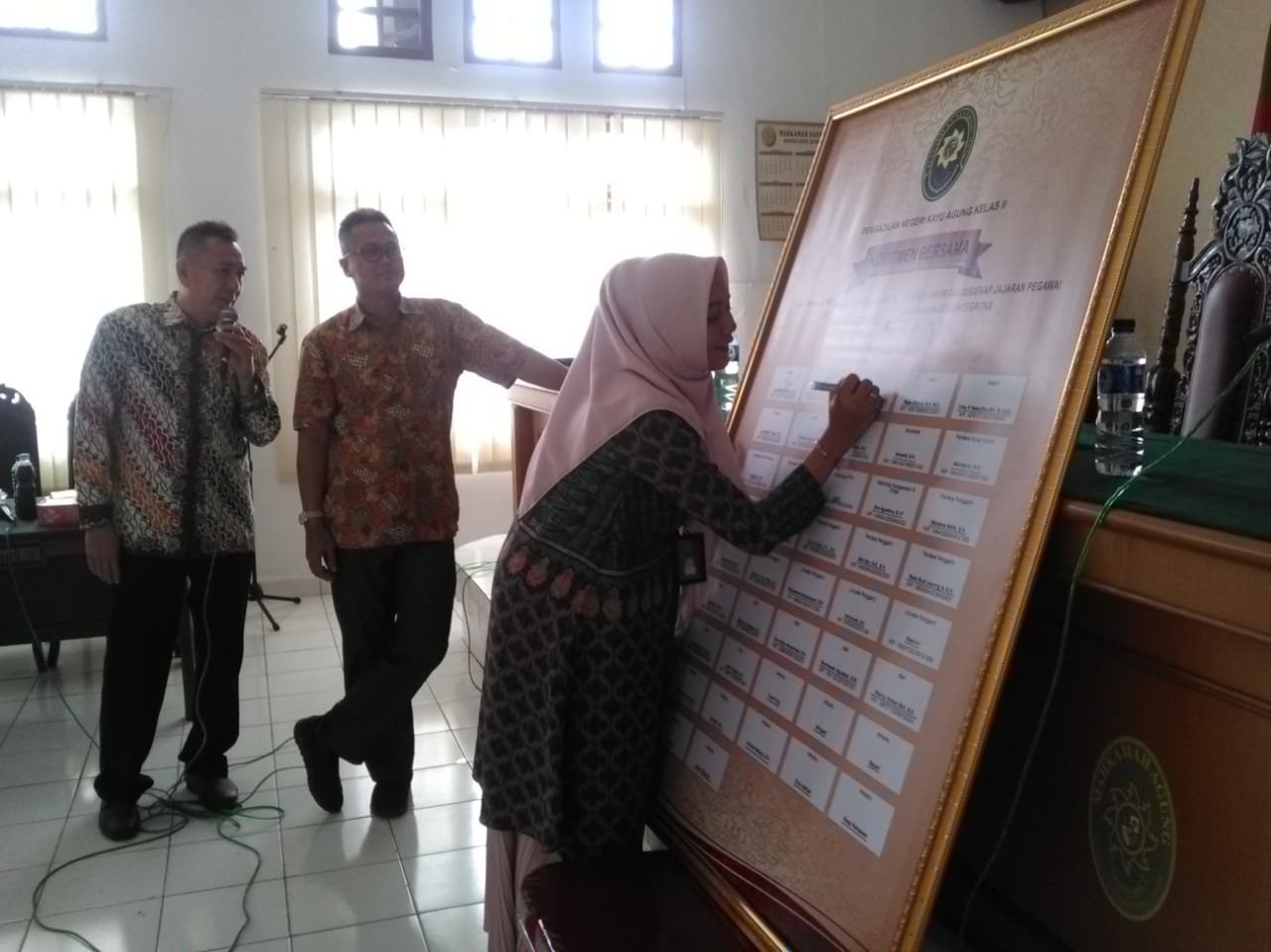 Ogan Komering Ilir I Guna menuju Wilayah Bebas dari Korupsi (WBK) dan Wilayah Birokrasi Bersih dan Melayani (WBBM) dalam satuan kerja khususnya di Pengadilan Negeri (PN) Kayuagung, dilakukan penandatanganan pembangunan Zona Integritas seluruh pegawainya. Di Aula PN Kayuagung, kemarin.