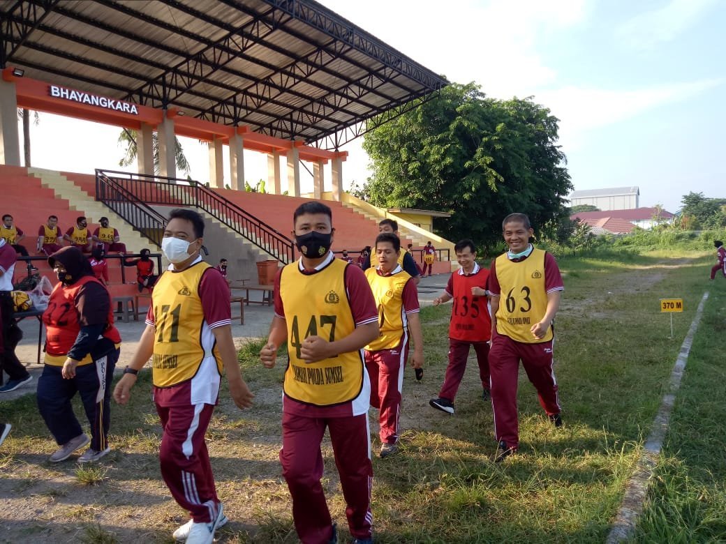 Palembang l Personel Bidang Humas Polda Sumsel mengikuti kesamaptaan jasmani guna mengukur kemampuan fisik Personel Polri maupun Pegawai Negeri Sipil (PNS) Polda Sumsel dilapangan Stadion Wira Bhakti Pakri Palembang, Rabu (22/09/2021).