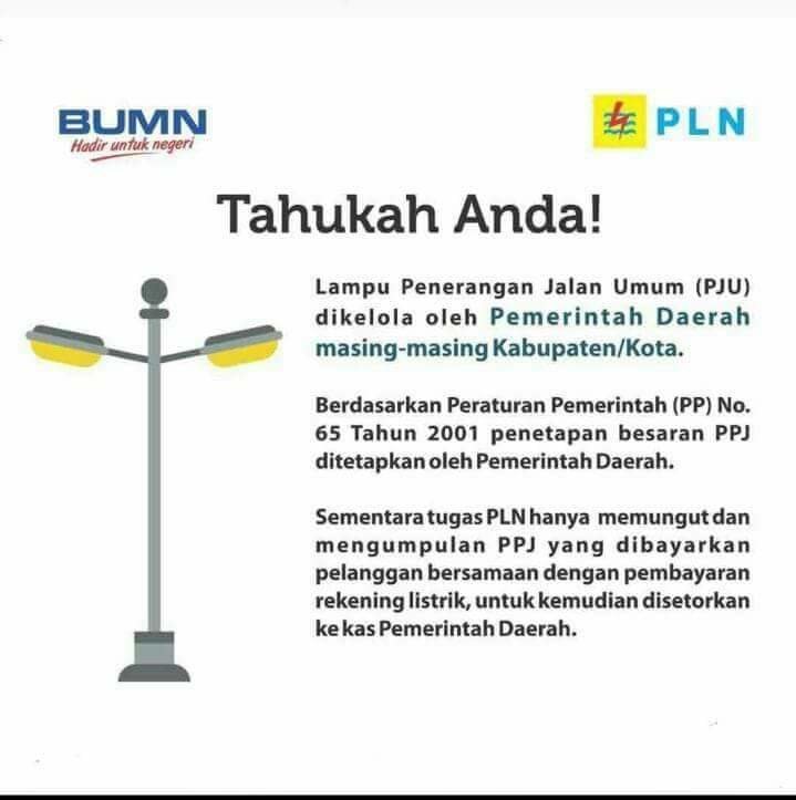 “Besarnya PPJ ditetapkan berdasarkan Kewenangan Pemda dan DPRD setempat, PPJ juga merupakan salah satu sumber Pendapatan Asli Daerah (PAD) bagi Pemerintah setempat yang dapat digunakan untuk pembiayaan pengembangan dan pembangunan daerah,” Kata Manager Bidang SDM PT PLN Wilayah S2JB, Lala Arief Fadillah kepada media, Minggu (16/9/2018).