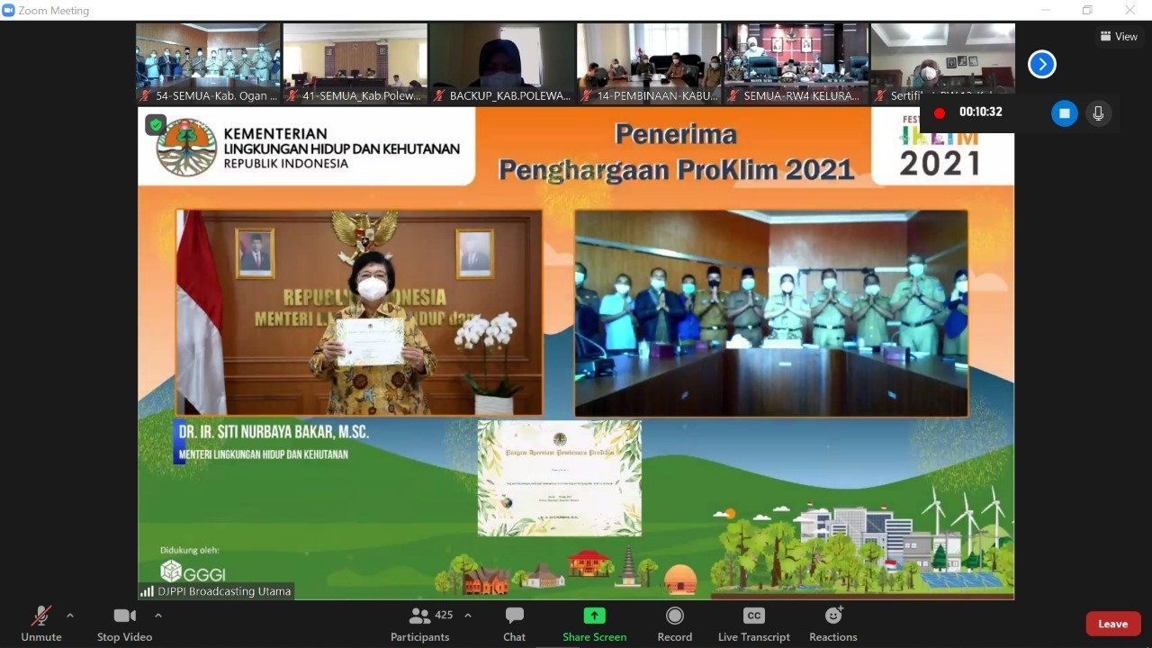 Penyerahan penghargaan tersebut dilakukan secara virtual dalam acara Puncak Festival Iklim Tahun 2021, dengan tema “penurunan emisi gas rumah kaca dan peningkatan ketahanan iklim untuk Indonesia tangguh Indonesia tumbuh,” Selasa (19/10/21)