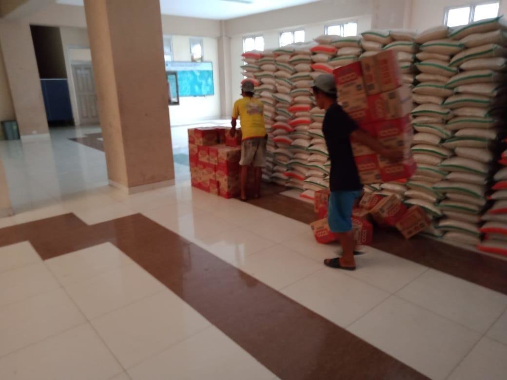 Ogan Komering Ilir | Ratusan ton paket sembako Bantuan Sosial (Bansos) dalam rangka jaring pengaman sosial Covid-19 di Kabupaten Ogan Komering Ilir tiba di Gedung Olahraga (GOR) Perahu Kajang Kayuagung, pada Kamis, (7/4).