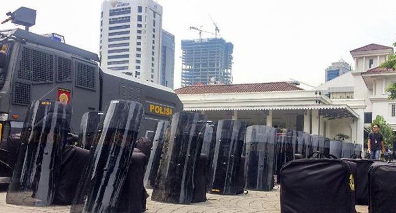 Polisi bersenjata laras panjang dan prajurit TNI tampak berjaga di depan kompleks. Massa sempat maju mendekati polisi, lalu mundur ke arah Taman Waduk Pluit yang ada di samping kompleks.