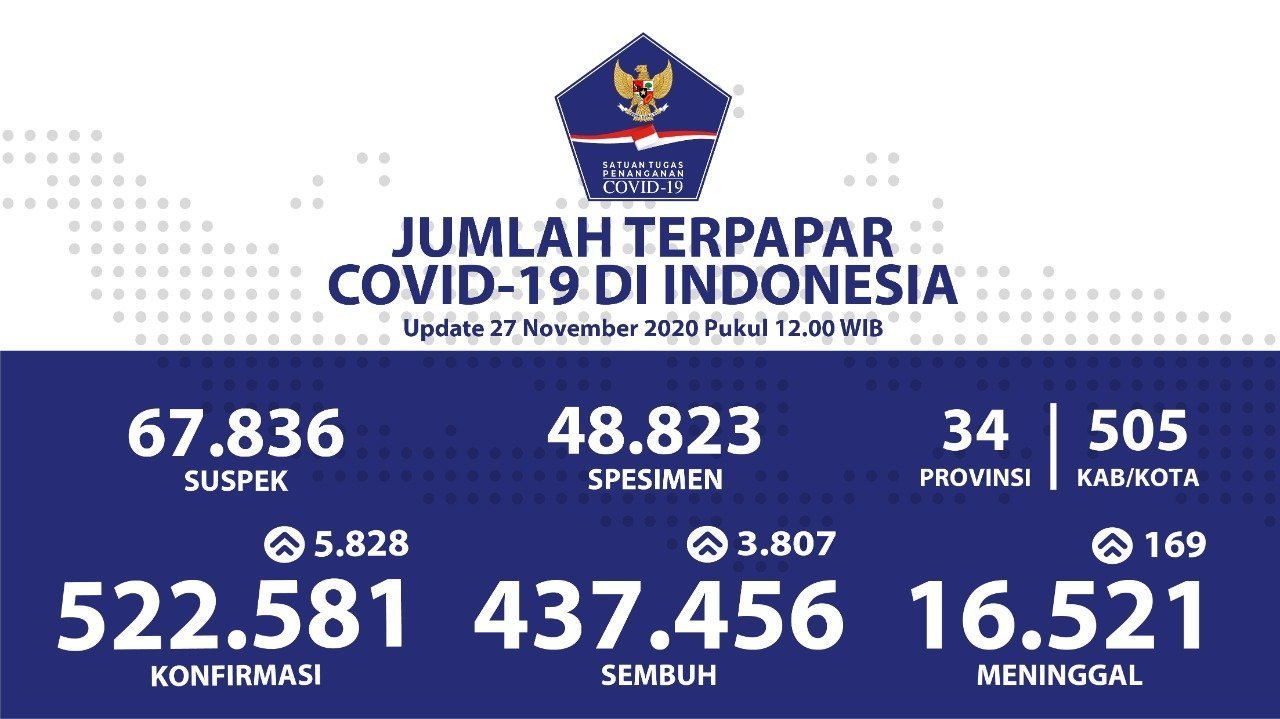 Beritamusi.co.id | Dari data Kementerian Kesehatan per 27 November 2020, pasien sembuh COVID-19 hari ini bertambah lagi sebanyak 3.807 orang. Penambahan hari ini terus meningkatkan jumlah kesembuhan kumulatif menjadi 437.456 orang atau 83,7%. Pada penambahan pasien terkonfirmasi positif harian bertambah sebanyak 5.828 kasus. Untuk jumlah kumulatif atau pasien yang tercatat terkonfirmasi positif sejak kasus pertama hingga saat ini berjumlah 522.581 kasus.