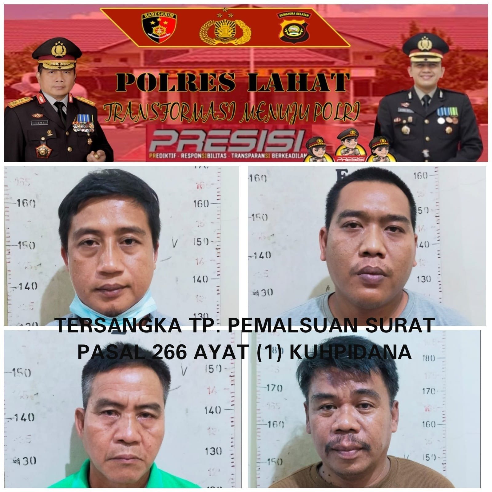 ” Dalam hal ini tersangka Melanggar pasal 266 ayat (1) KUHPidana DN (28) warga Gang Musolah AL-Minah RT/RW 03/06 Kelurahan Talang Jawa Utara Kecamatan Lahat Kabupaten Lahat, Melanggar pasal 480 ayat (2) KUHPidana Yunesco Bin Hairul Anhar (35) warga Desa Lubuk Betung Kecamatan Merapi selatan Kabupaten Lahat, Damsari (52) warga Desa tanjung pinang Kecamatan Merapi barat Kabupaten Lahat dan Riduan Efendi (48) warga Desa Kota Raya Kecamatan Lahat Kabupaten Lahat,” terangnya.