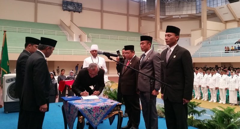Para pejabat tersebut terdiri dari Pejabat Pimpinan tinggi Pratama, administrator dan pengawas yang akan menempati Organisasi Perangkat Daerah (OPD) yang akan mulai efektif tahun 2017, tampak ikut juga dikukuhkan Sekda OKI H Husin Msi.