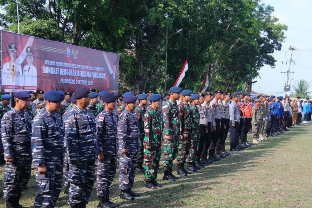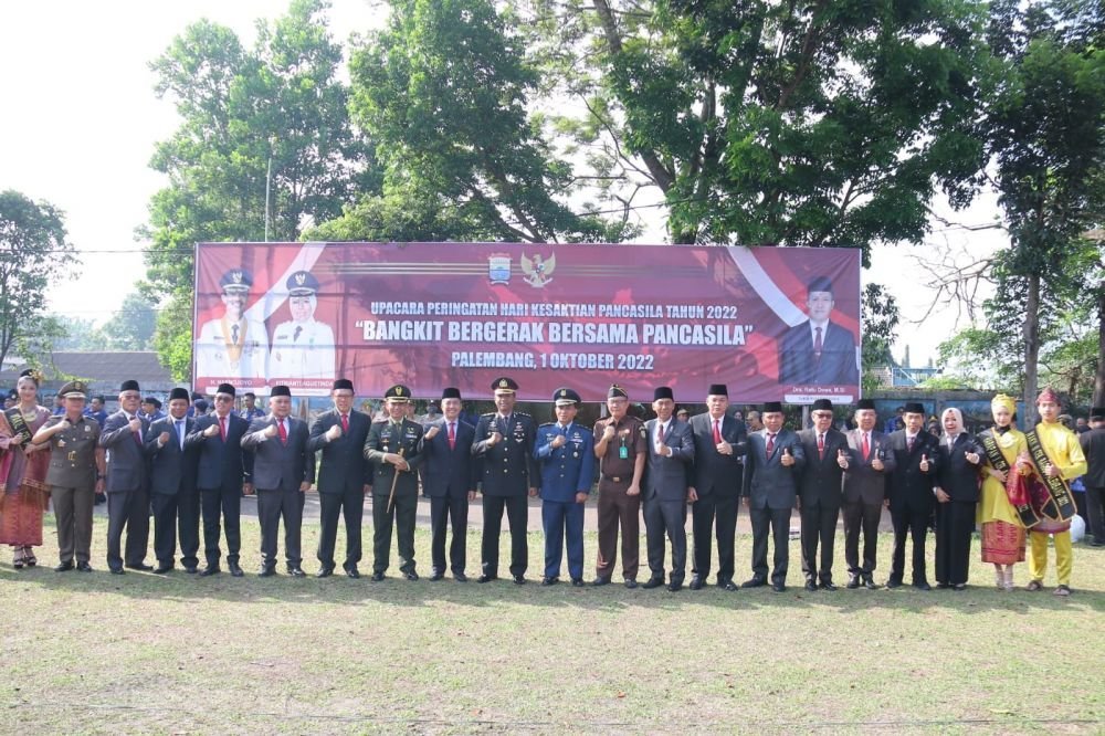Dalam memperingati Hari Kesaktian Pancasila, Pemerintah Kota (Pemkot) Palembang bersama Forkopimda dan seluruh OPD sengaja menggelar Upacara Peringatan Hari Kesaktian Pancasila di Lapangan Pramuka Kwarcab Palembang, Sabtu (1/10/2022).