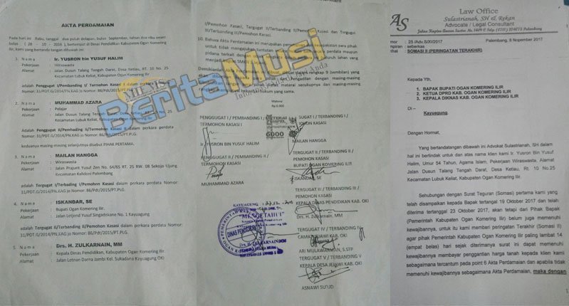 Surat akta perdamaian antara penggugat dan tergugat dan surat somasi yang dilayangkan penggugat kepada pemkab OKI selaku tergugat.