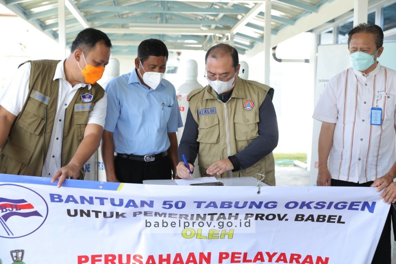 PANGKALPINANG – Pemerintah Provinsi Kepulauan Bangka Belitung (Pemprov Babel) menerima bantuan tabung oksigen sebanyak 50 tabung dari Perusahaan Pelayaran PT Bangka Jaya Line.