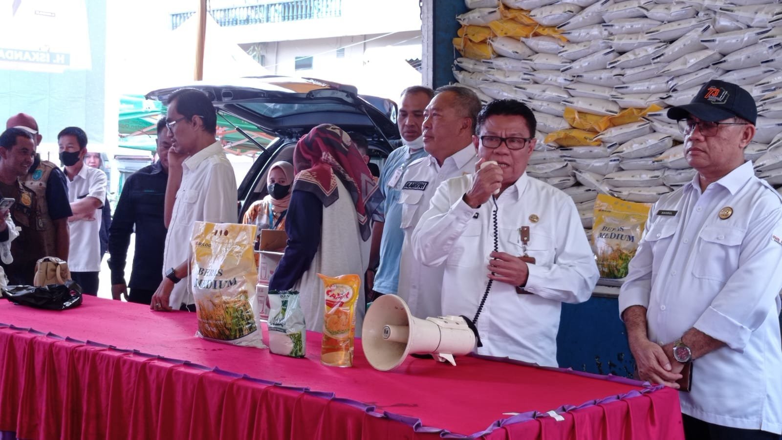 Sebelumnya, Kepala Dinas Perdagangan, Drs. H. Alamsyah, M.Si melaporkan terdapat 10 ton beras yang dijual secara murah bekerja sama dengan Perum Bulog.